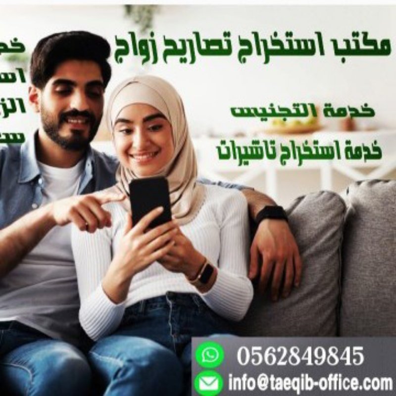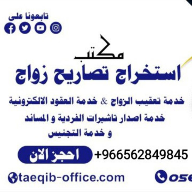 يوجد لدينا فريق عمل لاستخراج تصاريح الزواج و الموافقة خلال فترة قصيرة للسعوديين و الاجانب استخراج موافقة زواج مواطن من اجنبية و زواج اجنبي من مواطنة تأشيرات مهنية و فنية ( مؤسسات – مصانع – شركات – مطاعم ) جميع الانشطة و المهن و جميع الجنسيات يوجد لدينا فريق عمل لاستخراج تصاريح الزواج و الموافقة خلال فترة قصيرة للسعوديين و الاجانب
